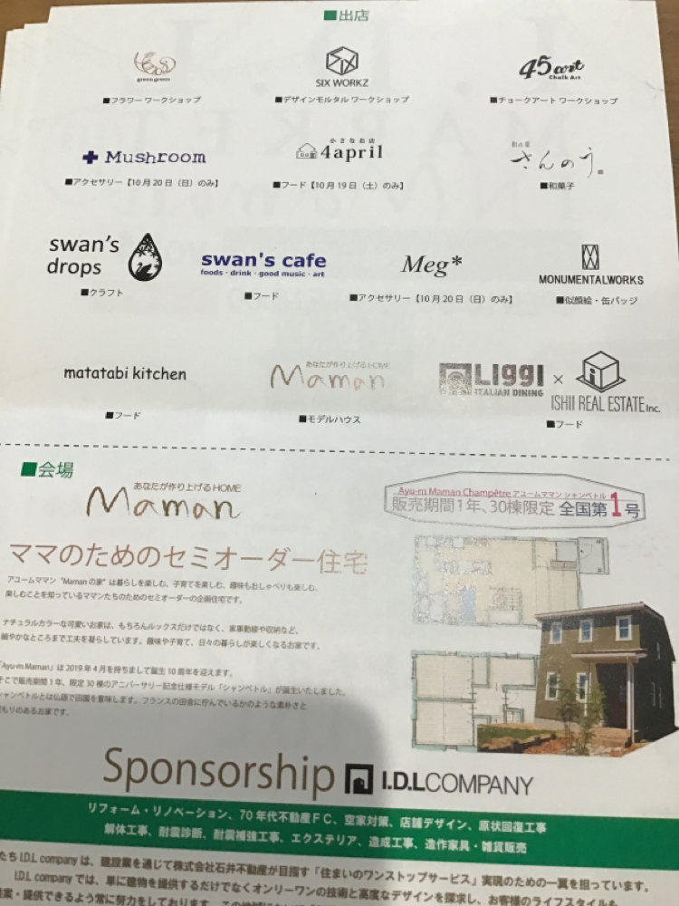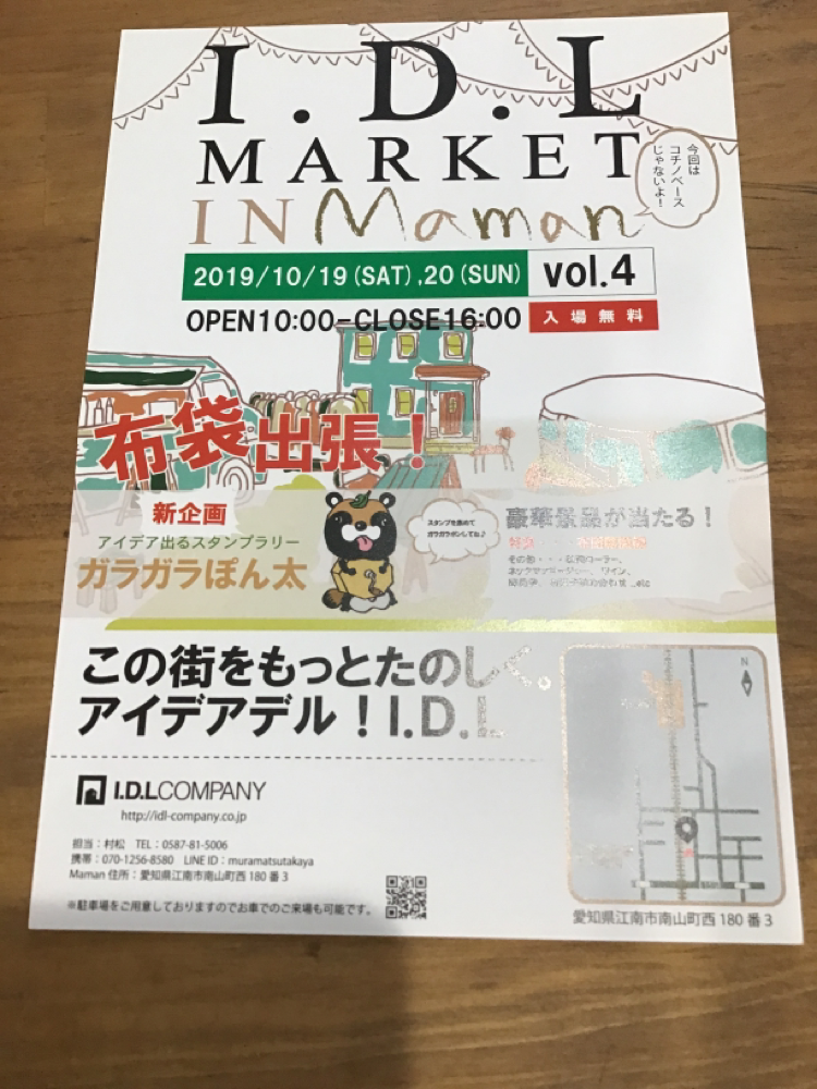 18日 10月 2019 I D L market in Maman 10/19 20日 どこ行こうって思ってる方 布袋のマルシェいきましょw 私推しは チョークアートの45artさん ヴィーガンのmatatabi kitchenさん ほか出店も多数 tagPlaceholderカテゴリ: 独り言